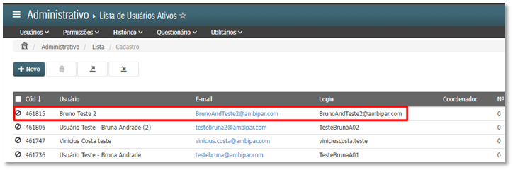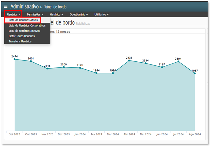 Acesse o menu Usuários e clique em Lista de Usuários Ativos