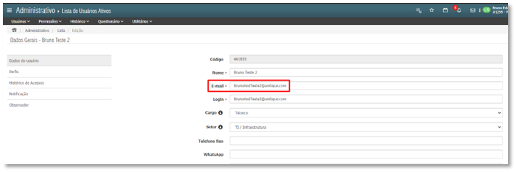 Ao abrir a tela com os dados de cadastros do usuário selecionado é possível alterar o e-mail.