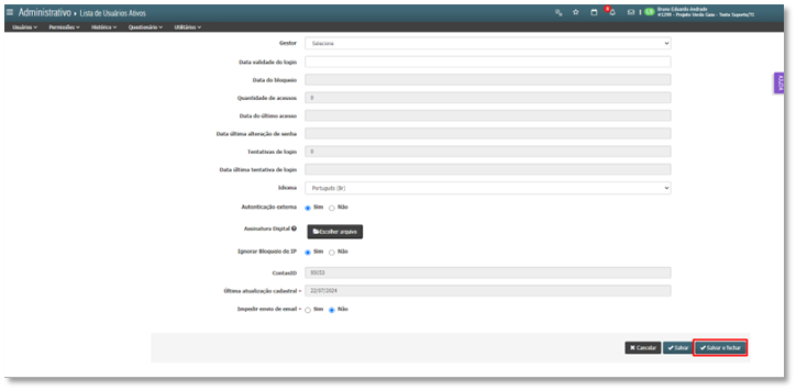 Após alterar o e-mail, desça a tela e clique sobre “Salvar e Fechar”