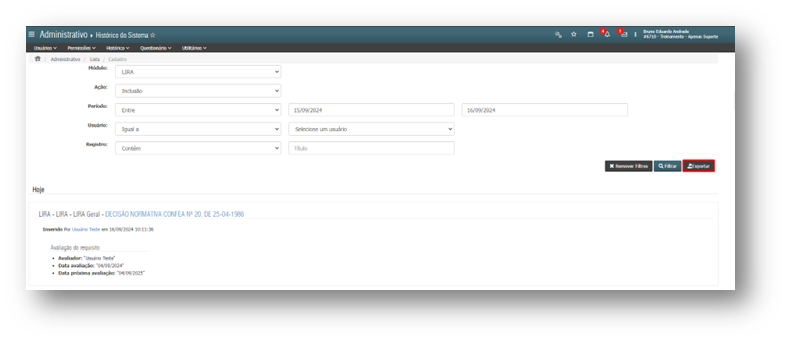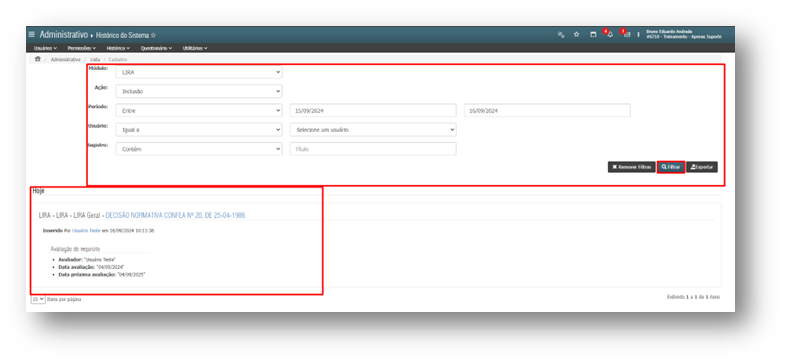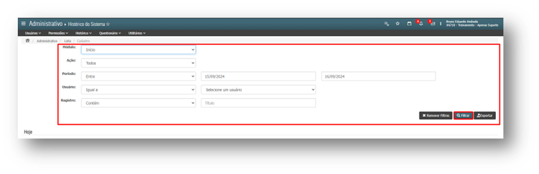 O histórico oferece várias opções de filtro que podem ser combinadas para obter os resultados desejados. Os filtros disponíveis incluem módulo, período, usuários e registros.
