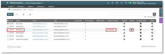 O usuário que possui data validade de login vencida ficará no sistema com status de EXPIRADO. Para que o usuário consiga acessar o sistema é necessário remover a data ou atualizá-la.