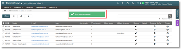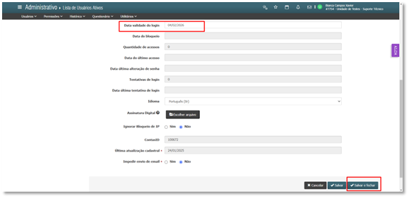 NOTA: Vale ressaltar que a data de validade de login só deve ser utilizada em casos que o usuário possui um período definido de acesso ao sistema, pois essa data bloqueia o acesso.