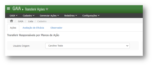 Na lista Usuário Origem, selecione o usuário que é atualmente responsável pelos planos de ação que se deseja transferir.