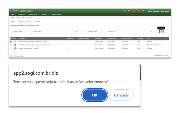Clique em Transferir e confirme a operação clicando em Ok.