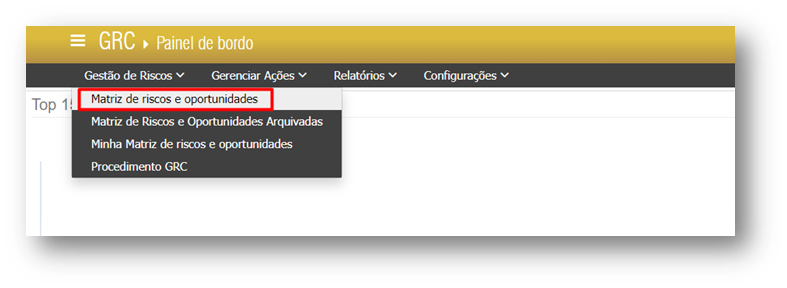 Para cadastrar um Risco ou Oportunidade, acesse o menu GRC e depois clique em MATRIZ DE RISCOS E OPORTUNIDADE