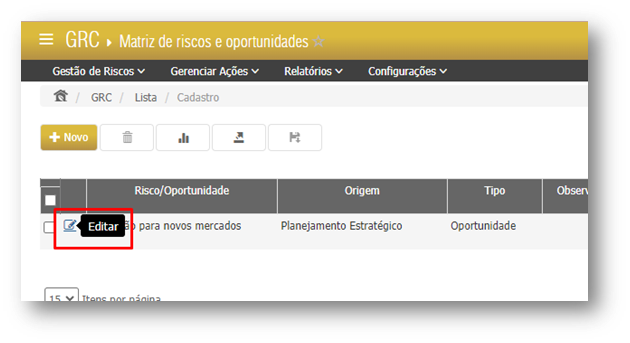 Para editar o Risco/Oportunidade cadastrado, acessar o menu Gestão de Risco e clicar sobre “Editar”