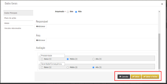 Após o preenchimento dos campos, ao menos os obrigatórios, o usuário deverá clicar em Salvar e Fechar ou apenas em Salvar caso deseje realizar a inclusão de outra informação, como os planos de ações. Caso deseje interromper o cadastro, clique em Cancelar.