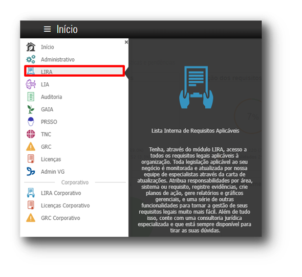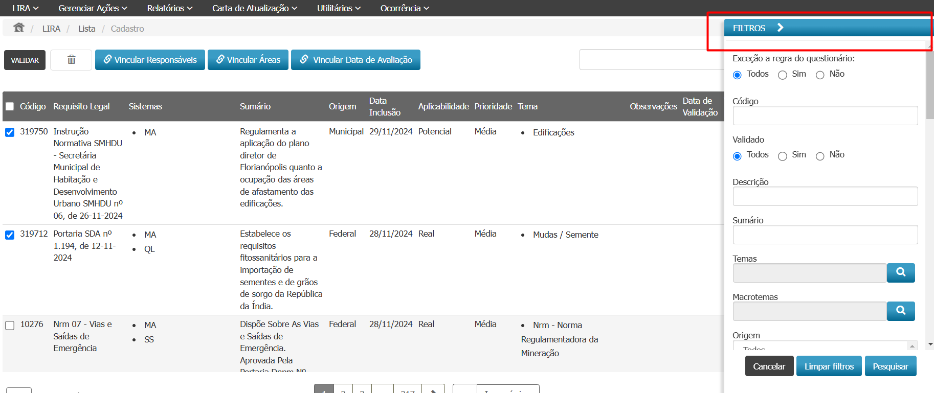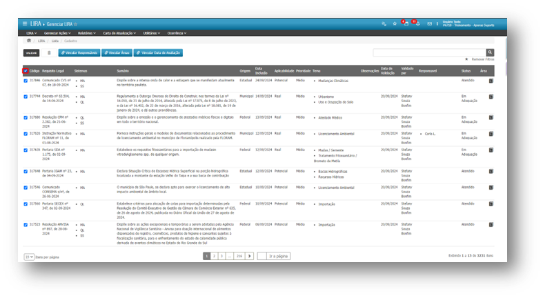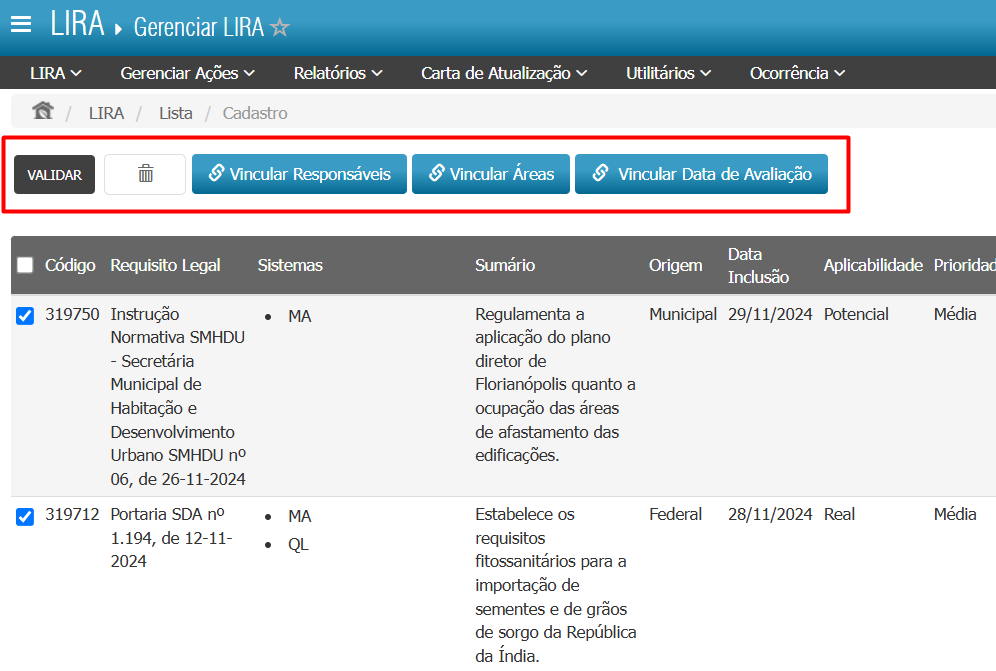 No menu “Gerenciar Lira” é possível que o usuário valide, exclua, vincule responsáveis e áreas a mais de um requisito por vez.