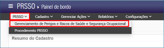 No módulo PRSSO, clique no menu PRSSO e acesse o item “Gerenciamento de Perigos e Riscos de Saúde e Segurança Ocupacional”.